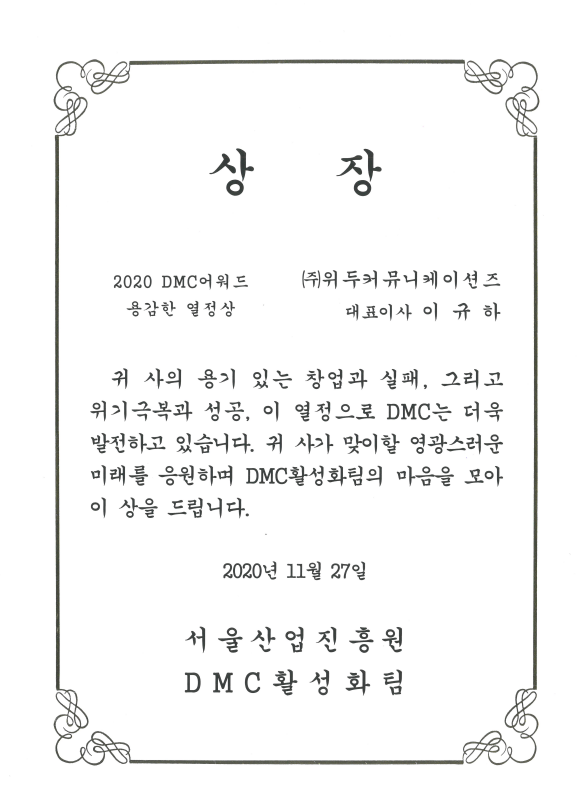 2020 서울산업진흥원 2020 DMC어워드 페이지 정보 작성자 WeDu 댓글 0건 조회 4,244회 작성일 21-12-31 12:57 본문 2020-11-27 2020 DMC어워드 용감한 열정상 서울산업진흥원 DMC활성화팀 List Previous2020 기술혁신 우수기업 21.12.31 Next2018 소년한국 우수 어린이 도서 19.05.30
