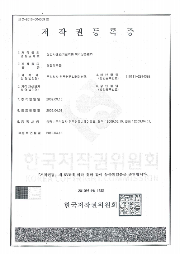 [한국/저작권] 신입사원조기전력화 이러닝 콘텐츠 페이지 정보 작성자 WeDu 댓글 0건 조회 6,571회 작성일 19-05-30 19:01 본문 2010-04-13 저작권 C-2010-004069 신입사원조기전력화 이러닝콘텐츠 / 편집저작물 List Previous[한국/저작권] 리안의 수학 모험 19.05.30 Next[한국/상표] OLL 41류 19.05.30