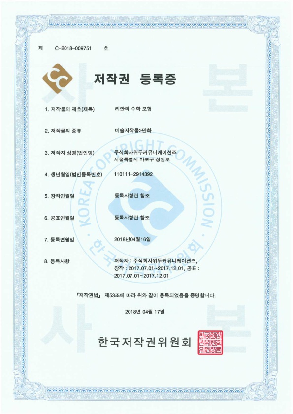 [한국/저작권] 리안의 수학 모험 페이지 정보 작성자 WeDu 댓글 0건 조회 6,504회 작성일 19-05-30 19:07 본문 2018-04-16 저작권 C-2018-009751 리안의 수학 모험 / 미술저작물>만화 List Previous[한국/저작권] 길리 19.05.30 Next[한국/저작권] 신입사원조기전력화 이러닝 콘텐츠 19.05.30